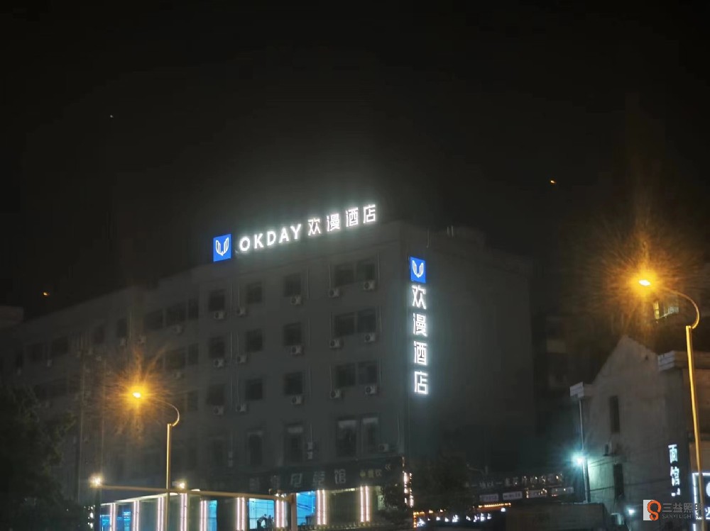 益陽市歡漫酒店外墻發光字采用不銹鋼制作面殼和底亮,亞克力面板,內置藍景光源,熱鍍鋅方通鋼架。